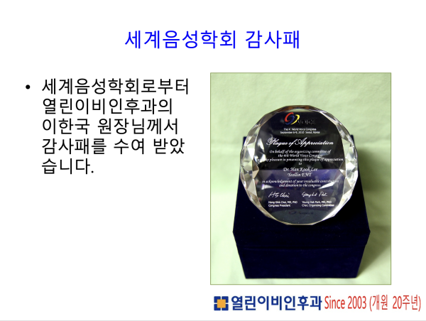 이한국원장님께서는 제 4회 세계음성학회에서 감사패를 수여 받았습니다.
