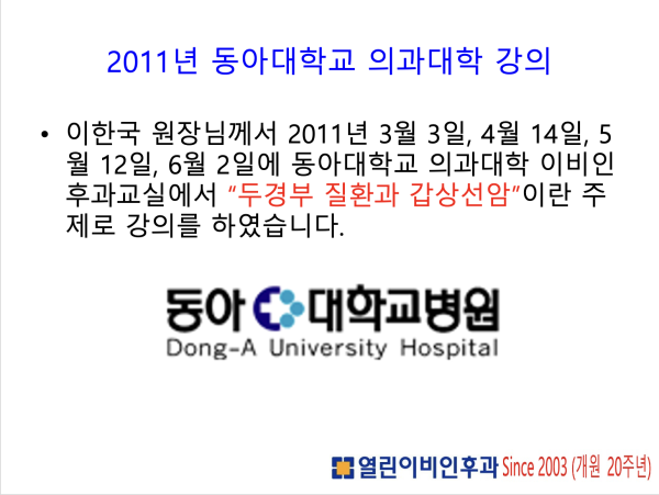 이한국원장님께서는 2011년 동아대학교 의과대학에서 두경부 질환과 갑상선암을 주제로 강의를 하였습니다.